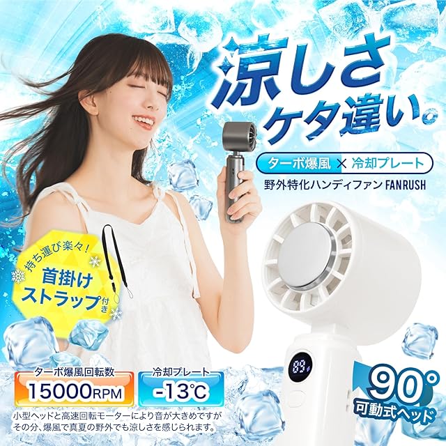 福岡県に本社を構えるベルモンドの「FanRush(ファンラッシュ)」は、ターボ爆風と-13℃のペルチェ冷却プレートを搭載した"野外特化"のハンディファンです。最大15,000RPMの回転数を誇るターボ風が、ドライヤー並みの強力な風を生み出し、真夏の屋外でもしっかりと涼しさを提供します。冷却プレートは触れると瞬時に-13℃の冷却効果を発揮し、外気温に影響されることなく、ひんやりとした涼しさを感じることができます。キャンプ、野外フェス、ライブ、スポーツ観戦など、普通のファンでは物足りなかった方に最適です! 【風力調整】風量は4段階で調整可能。1段階目でも一般的なハンディファンの最大風速以上の5.0m/s、最大風速は11.5m/sです。強い風が遠くまで届き、野外など暑い環境でも十分に冷却を実感できます。【本物のペルチェ素子冷却プレートを採用】冷却プレートを限界まで外側に突き出した「でっぱり仕様」により、ファン本体が肌に触れるのを防ぎ、冷やしたい部分にピタッと当てやすい設計に。効率的にしっかり冷却できます。プレートが触れた瞬間の皮膚表面温度は-13℃を記録。猛暑の野外でも安定した冷却効果を提供します。 【90°可動式のヘッドと首掛けストラップ】90°可動式のヘッドで、使用シーンに応じて最適な角度に調整できます。さらに、首掛けストラップが付属しており、両手を自由に使いたい場面でも便利に使用できます。【収納式フックスタンド】収納できないリング型フックには折れやすいというデメリットがあります。FanRushでは、収納式フックを採用することで、破損しにくく、コンパクトに収納できる設計を実現しました。 【長時間使用可能】最大25時間の連続使用が可能な大容量4000mAhバッテリーを搭載しています。USB Type-Cで充電でき、外出先でも安心して使用可能。また、わずか185gの軽量設計で、長時間使用しても手が疲れにくいです。【誤作動防止】電源のON/OFFはボタンの長押しで操作する仕様になっており、カバンの中などで誤って電源が入ってしまうのを防ぎます。 【さまざまなシーンで活躍】「FanRush」は、ライブ、アウトドア、キャンプ、スポーツ観戦など、真夏の野外イベントでも大活躍します。さらに、コンパクトで持ち運びやすく、収納式のフックスタンドを搭載しているため、デスクでも便利に使用できます。【セット内容】本体×1、首掛けストラップ、USB-A to Cケーブル(約1m)、取扱い説明書兼保証書【注意】ご使用前には、必ず取扱い説明書をご確認ください。