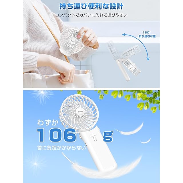【安全性と品質を重視 取り外して清潔可】弊社のハンディファンは発火や爆発によるリスクを回避するため、長時間のテストを行い、安全PCB回路基板を内蔵し、 独立したリチウム電池を採用し、過充電、過放電、短絡を回避し、使用寿命を延長しながら危険性も回避します。安全保護設計でお客様は安心してご利用いただけます。なお、ハンディファンの前カバーが本体から簡単に取り外し可能、季節の終わりに羽根にあるホコリや汚れなどをきれいに掃除して、来年の夏でも気持ちよく使えるように丁寧にお手入れをしてあげましょう。ご注意:お手入れ方法は付属の説明書をご参考ください。