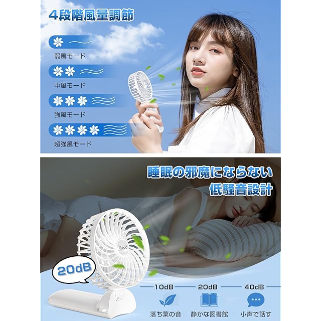 【4段階風量切替&7枚羽根&流線型設計】手持ち扇風機は弱・中・強・超強の4段階の風量調節機能が搭載、風量切替ボタンを押すたびに、自然に近い優しい風からパワフルな風まできめ細かく風量を調節することが可能。室内では1~3段目の自然風と微風と弱風モードで優しく自然風を再現し、超静音で職場や図書館でも快適に過ごせます。夏場の野外では4段目の超強風でパワフル送風し、猛暑でもより爽やかな涼感をもたらします。従来品と比べ、弊社の手持ち扇風機は7枚羽根を採用、羽根全体を流線型デザインにすることで、羽根の中心を効率的に活用して風を集めます。空気抵抗を減らすことで、風速の変動幅が小さく、バランスのとれたなめらかな風を生み出します。