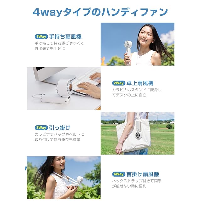 【一台多役・カラビナ&ストラップ付き・持ち運びに便利】手持ち、卓上、腰掛け、首掛け鞄掛けの5wayで使える便利なハンディファンです。カラビナがスタンドに変身してデスクの上に自立して使用することも可能、バッグやベルトなどに引っ掛けて持ち運べるのが便利!ネックストラップも付きで持ちやすく、いつでもどこでも涼しさを楽しむことができます。コンパクトなサイズで女性でも握りやすい細めの設計のため、持ち歩きの使用にも便利です。さらに、超コンパクトなのでバッグにすっぽり収納可能。