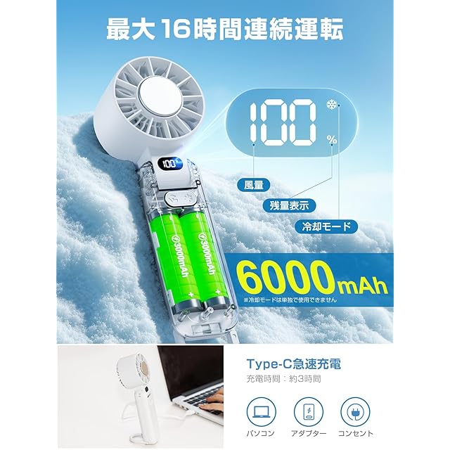 【6000mAh大容量・最長16時間稼働・省エネ設計】一般的な携帯扇風機の電池容量よりも約2倍の6000mAhの大容量バッテリーを搭載し、弱モードでは最長16時間連続稼働、フル充電はわずか3時間で完了。消費電力を抑えた省エネ設計のハンディ扇風機です。外で長時間過ごすときに電源切れの心配なく、涼しく快適な一日を楽しむことができます。旅行、メイク、まつげ、キャンプ、屋内外などに最適なミニ扇風機。