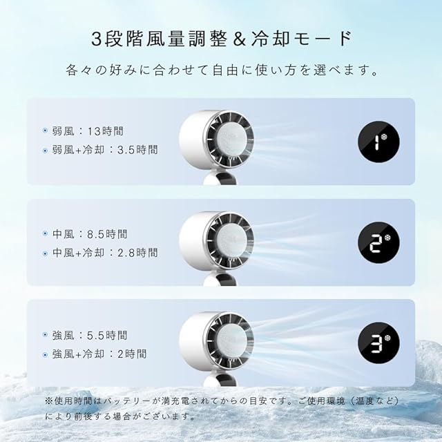 【3段階風量調整可能・大容量バッテリー内蔵】ファンのボタンを押すことで、風量を強・中・弱の3段階からお選びいただけます。設定風量と合わせてデジタルスクリーンには数字が表示されます、とてもわかりやすくて使いやすい。5000mAhの大容量バッテリーを内蔵しており、バッテリーをフル充電してからは、最大13時間ほど連続使用可能です。(風量弱での目安使用時間になります。)外出の際でも安心にお使いいただけます。