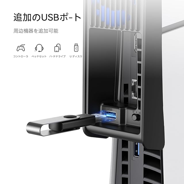 【USB 3.0 搭載】純正のps5用 冷却ファンは追加的なUSB 3.0 ポートが装備されており、新型PS5 slim 本体元の USB ポートを占有しなく、 コントローラー、ヘッドセット、U ディスクなどの ps5 周辺機器を接続できるようになります。