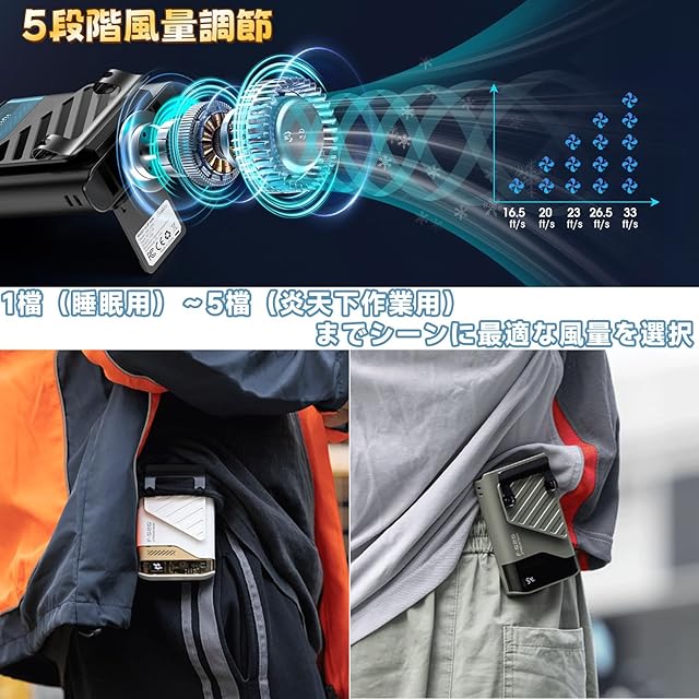 【人間工学に基づいた3WAY設計】付属のクリップで腰ベルト・バックパック・テントポールに瞬時装着。5段階風力調整:1檔(睡眠用)~5檔(炎天下作業用)までシーンに最適な風量を選択。あらゆるアクティビティに対応する万能な冷却 – 釣り、ハイキング、キャンプ、サイクリングなど、この屋外用冷却ファンは一日中快適に過ごせます。