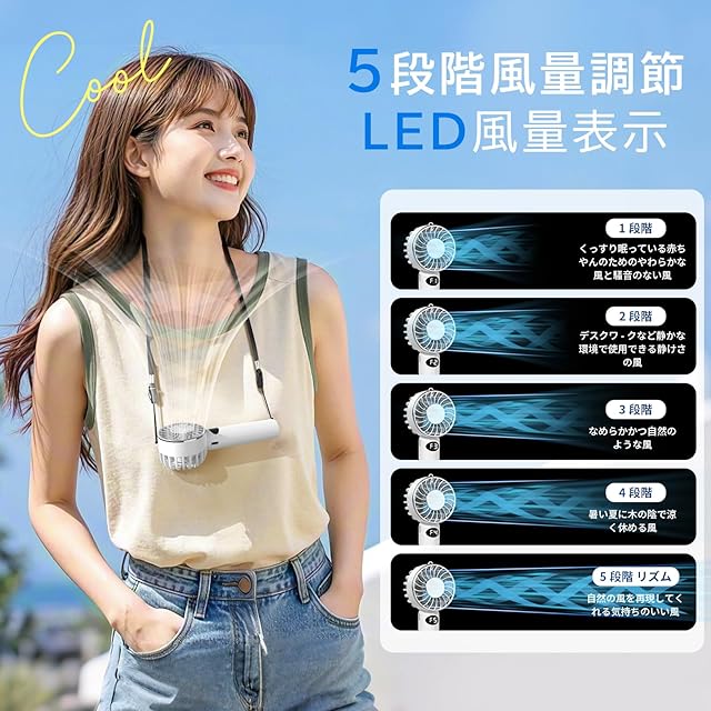 ❄【二重扇葉設計・12枚羽根・超高速大風量・5段階風量調節】革新的なツインターボ設計を採用し、12枚の羽根と二重扇葉設計により、従来品と比べ、同じタイプの5枚羽の携帯扇風機より50%風力アップされ、回転速度が速くなり,風が強力でまっすぐ強い風を吹かせます。顔の近くで風を起こすことで、体感温度を下げられ、もっと涼しい、猛暑日にも快適です。ファンのボタンを押すだけで、5段階に風量を調節でき、使用シーンに合わせてお好みの風力を自由に調節できます。弱・中風モードで超静音で職場や図書館でも快適に使用できます。また、強・超強・最強風モードでは風がしっかりと吹き出し、20cm離れても涼しさを感じることができます。