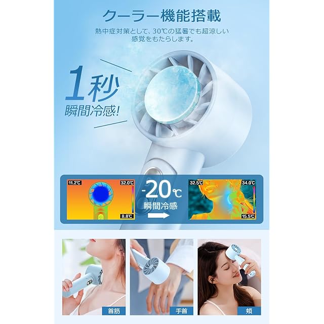 【1秒瞬間冷感!冷却プレート付きハンディファン】この新登場の冷却プレート付き扇風機は、2秒間長押しすると冷却モードを始め、氷のような触感を実現します。ペルチェ式の冷却プレートを首や手首などに当てるだけで、一瞬で温度を下げることができるため、真夏の熱中症対策として最適です。炎暑の日には、蒸し暑い満員電車の中でも、会社、車内、通勤、室内、アウトドア、ライプ、花火大会や祭り、スポーツ観戦などさまざまなシーンで大活躍します。本携帯扇風機はPSEマーク取得済、安心*安全にご使用いただけます。