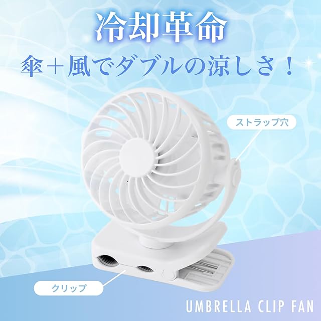 【傘につけられる】アンブレラクリップファンなら夏の日傘・雨傘に取り付けられて快適に!普段の通勤・通学から旅先のアウトドアまでおすすめです。