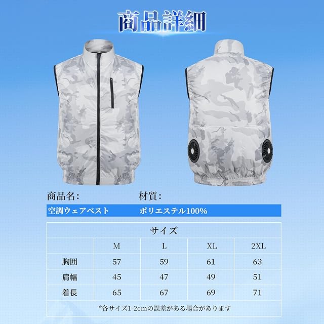 【品質保証&セット内容】セット内容:空調ベスト×1、ファン×2、専用バッテリー×1、ファンスイッチ付きケーブル×1、バッテリー充電用ケーブル×1、取扱説明書×1;当社は1年保証期間と長期のカスタマーサポート(24時間以内対応)をご提供いたします。この空調ウェアについて、ご満足頂けなかった場合、ご購入のショップからメールで弊社にお問い合わせください。ご連絡の方法:「アカウントサービス」→「注文履歴」→「販売元」→「質問する」または説明書に記載されている他の連絡先から、お気軽にお問い合せ下さい。