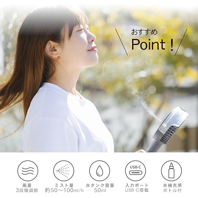 【ミスト機能搭載】ミストの力で今までにない清涼感を得ることができます。炎天下の熱中症対策としてご使用ください。