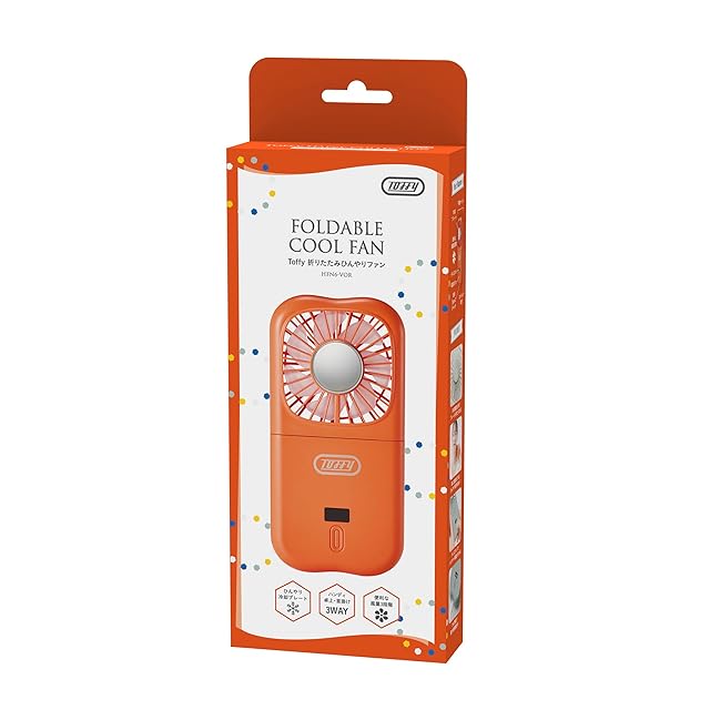 <b>肌に当てると冷たい冷却プレート付き!<br><br> 完全に折りたためるからコンパクトに持ち運びできます。<br> 夏のイベントや通勤・通学等、外出先で大活躍!<br><br> ●折りたたんでコンパクトに収納!<br> 完全に折りたためるので、コンパクトに収納可能。<br> 持ち運びもスマートに!<br><br> ●肌に当てると冷たい冷却プレート付き!<br> 冷却モードでは中央の冷却プレートがひんやり冷たくなります!<br> 風だけでなく、直接冷たさを感じることができます!<br><br> ●ハンディ/卓上/首掛けの3WAY!<br> ✔ハンディ<br> 手になじみやすいサイズ感と直線的なデザインで持ちやすい。<br><br> ✔卓上<br> 折りたたんで卓上ファンとしても◎<br> 角度の調節も可能です!<br><br> ✔首掛け<br> 首掛けストラップが付属。<br> 安定するフラットな形状です。<br><br> ●充電量/風量が分かりやすいディスプレイ<br> 充電状況により、ディスプレイの数字が0~100に変化します。<br> 送風運転中は、風量が数字で1(弱)・2(中)・3(強)と表示されます。<br><br> ◆Toffy Happy Collection◆<br> すっきり気分が晴れない日でも私たちの心を温かく照らし、<br> 暮らしに明るさと楽しさをもたらす存在でありたい。<br>そんな願いを込めたコレクションです。<br> お部屋や身の回りを心地よく活気づけ、日常に“Happy”と“Lucky”をお届けします。