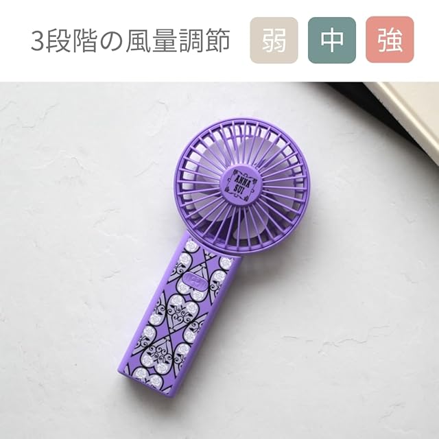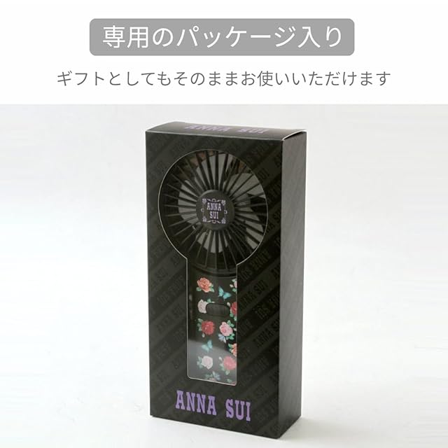 【商品の説明】折り曲げて卓上に置くこともできるポータブルハンディファン。専用BOXにハンディファンと収納用の巾着をセットしました。ANNA SUIならではのインパクトのあるデザインが目を惹き、ギフトにもおすすめです。 3段階の風量調節ができ、USBで充電できます。