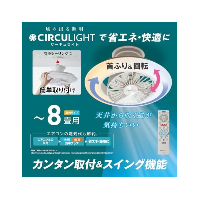【風の出る照明】ドウシシャ サーキュライト EZシリーズ スイングモデル シーリングファン 8畳 調光調色タイプ 簡単取り付けタイプ 自動スイングモデル リモコン付き