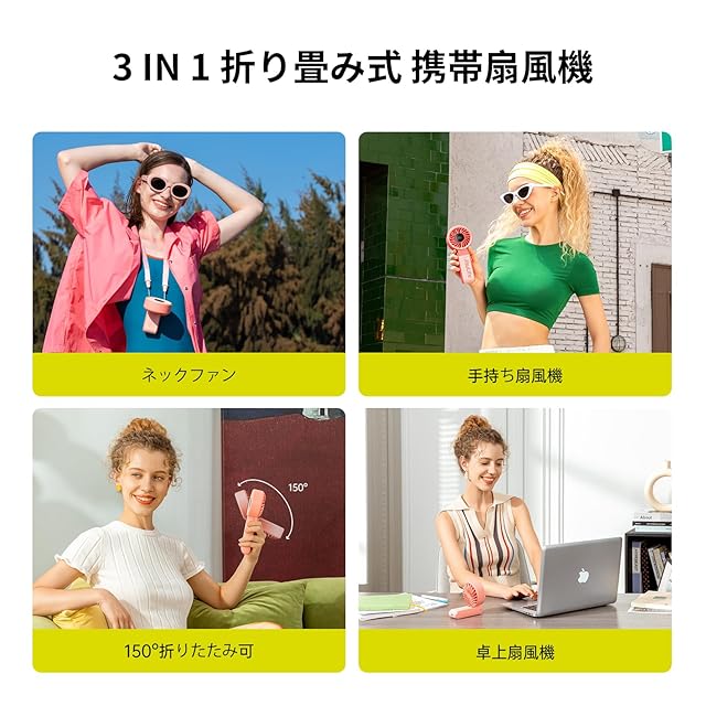 【2024新登場 · 3 IN 1超強力ハンディファン】新しい手持ち扇風機は、12枚羽根設計とアップグレードされたブラシレス モーターを採用しており、最大4.6m/sの冷気を吹き出すことができ、肌に涼しく快適な感触をもたらします。150° 折りたたみ可能で、3 IN 1の多機能で、手持ち、卓上、首掛けが可能です。 (ストラップ付き) 暑い夏に最適、熱中症対策にも最適です。