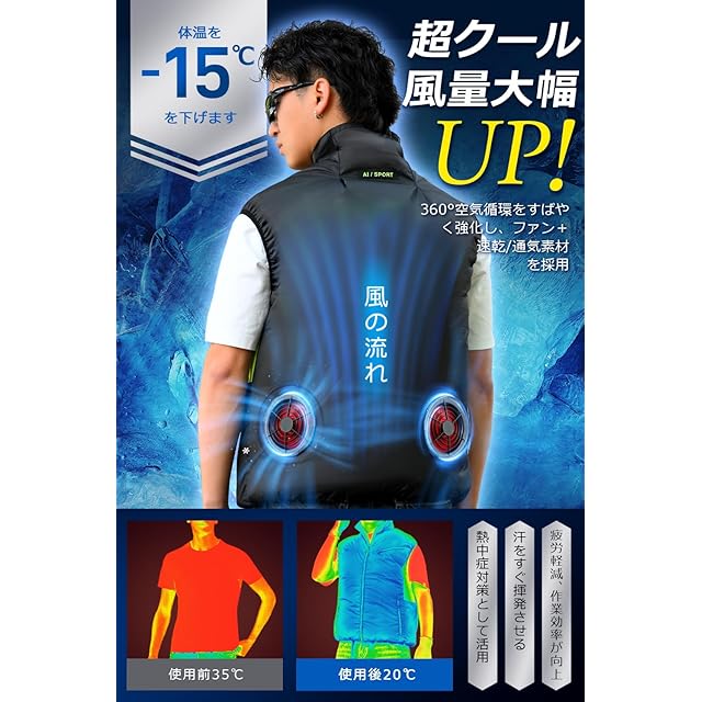 【撥水加工&3D循環送風】作業服 ベストは通気性が良く、UVカット機能も高いポリエステル素材を使用し、汗をかいてもすぐに乾きます。直立ネックラインデザインで3D換気効果を高め、首の周りの風を実現するのに役立ちます。二つファンを腰の両サイドに設置され、強力な風力で冷却ベスト内部で空気の循環を生み出し、人体から発散する熱を素早く吹き飛ばすことができます。摩耗に強く、また撥水加工もより強く施され、疲労軽減と不快軽減などにも効果が期待されます。
