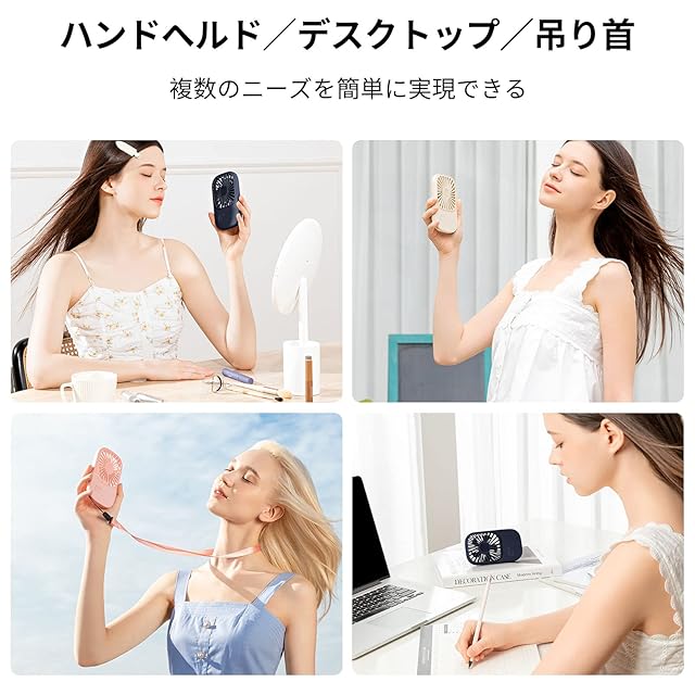【持ち運び便利&多用途】小型のハンディファンで、重さわずか104gのコンパクトなサイズで、ポケットやリュックにすっぽり入り、持ち運びにも便利です。 オフィス/寝室/メイクアップ/通勤/旅行/ピクニックなどのシーンでの使用に最適です。首に掛ける長いヒモが付属しているので、首掛け扇風機として使用できます。 背面スタンドデザインにより、数秒で卓上扇風機に変身します。必要に応じて、手持ち/卓上/首掛けモードの切り替えが可能です。