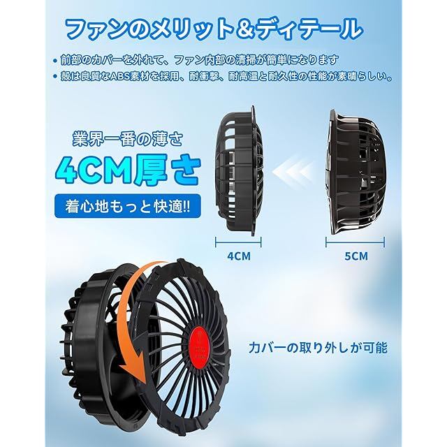【パラメータ/仕様/ セット内容】 つのファン重量:95g 梱包重量:190g 1つのファンのサイズ:10.5CM×9.5CM×4.5CM 取付穴の直径:9CM、 ファン動作電圧 15V 、必ず15Vの電源バッテリーをご使用ください。15Vを超える出力では、ファンが損傷する可能性があります。出力15V以下の場合は風量が弱くなったりすることがあります。 【強風・低騒音】ブラシレスモーターを装備しているこの高品質のファンは、同類製品に比べると、驚きほどのパワーで強力送風して涼しさを保つことができるだけでなく、低騒音。15V 強力 ファン付き 気流を胸方向や背中方向に集中させることも可能です。夏の幅広い現場作業において、疲労軽減、作業効率の向上、熱中症対策にも効果あります。 【15V高出力ファン&4段階風量調整機能付き】ファンとをグレードアップすることで、最大6000r/min、7.7m/sの効率的な風量で連続ハイパワー運転が可能となり、3枚羽根構造で騒音を低減しながら風量の安定性を向上させました。 エアコンスーツファンは、電源ボタンの短押しで、電圧15V:約7.7m/s、電圧11V:約6.1m/s、電圧8V:約4.5m/s、電圧6V:約3.3m/sのギア切り替えに対応しています。 【ブラシレスモーター&3枚羽根&超大風量】空冷服ファンは長寿命・低騒音のブラシレス高速モーターを採用し、強い風量を確保しながら気にならない回転音を実現しました。従来の空調ファンのモーターより、回転スピードが2倍以上向上です。作業服ファンは独自のジグザグ形の5枚羽根を採用したことにより、風量が一層アップし、瞬間的にクールダウンします。電気の変換効率を最大化し、エネルギー消費を節約します。ファンの最大風量は80L/S、最大回転数は6000RPM /minに達し、24時間連続して作動でき、使用寿命は20000時間以上に達することができます。また、作業服ファンがウェアから突起することがないフラット型ので、作業中の動作を妨げることなく快適な作業を実現しています。猛暑の夏に、工場や屋外作業などエアコンの使用できない環境で作業する人たちへの暑さ対策グッズです。高温の環境でも楽に仕事して作業効率を上げることができます。 【取り外し可能&熱中症対策の必需品】セット内容:20V ファン*2、DCファンケーブル*1 ★ファンの直径は9cmでほとんどの作業着の穴に取り付け出来ます。この新型改良な作業服ファンセットはカバーを回して取り外すことができるので、従来のファンセットに比べると清掃の手間が省けます。猛暑下で、工場や屋外作業などエアコンの使用できない高温環境でも楽に仕事して、作業効率も一層上げます。