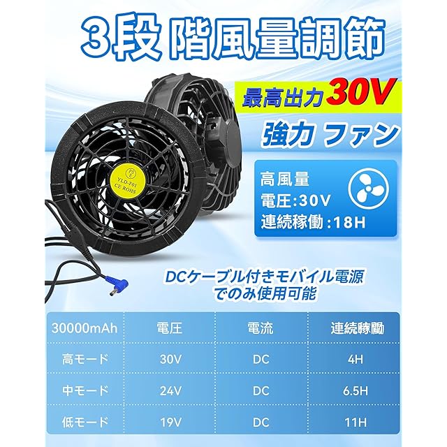 【パラメータ/仕様/ セット内容】 つのファン重量:95g 梱包重量:220g 1つのファンのサイズ:10.5CM×9.5CM×4CM 取付穴の直径:9CM、 ファン動作電圧 30V超強力 ファン 、必ず30Vの電源バッテリーをご使用ください。30Vを超える出力では、ファンが損傷する可能性があります。出力30V以下の場合は風量が弱くなったりすることがあります。 【強風・低騒音】ブラシレスモーターを装備しているこの高品質のファンは、同類製品に比べると、驚きほどのパワーで強力送風して涼しさを保つことができるだけでなく、低騒音。30V 超強力 ファン付き 気流を胸方向や背中方向に集中させることも可能です。夏の幅広い現場作業において、疲労軽減、作業効率の向上、熱中症対策にも効果あります。 【3段階風量調節・様々なシーンに対応】当社の30Vバッテリーと組み合わせてご使用の場合、電源ボタンを長押しすると、風量調節モードに入ります。電圧30V :約186リットル/秒、電圧24V :約168リットル/秒、電圧19V :約136リットル/秒、※風量はメーカー基準で測定した値です。ご使用時の目安としてください。※30V電圧は、30分の使用で自動的に24Vに切り替わり、その後は変更されません。工場内、工事現場、アウトドア、野外作業、農作業、運送、 建築業界、配達、出前、イベントスタッフ、室外環境の作業に適合し、様々なシーンで活躍します。 【取り外し可能&熱中症対策の必需品】セット内容:30V ファン*2、DCファンケーブル*1 ★ファンの直径は9cmでほとんどの作業着の穴に取り付け出来ます。この新型改良な作業服ファンセットはカバーを回して取り外すことができるので、従来のファンセットに比べると清掃の手間が省けます。猛暑下で、工場や屋外作業などエアコンの使用できない高温環境でも楽に仕事して、作業効率も一層上げます。 【様々な場面に適しています】い夏において、風冷式の調整可能な扇風機セット。最新型ファンはABS樹脂を使用し、衝撃に強い耐久性を兼ね備えています。建築・土木・工場内作業・漁業・林業・農場・農園・野外作業・運送業・倉庫内作業・登山・ウォーキング・ゴルフ・ツーリング・キャンプ等、夏のスポーツ・レジャーなど様々なシーンで大活躍!
