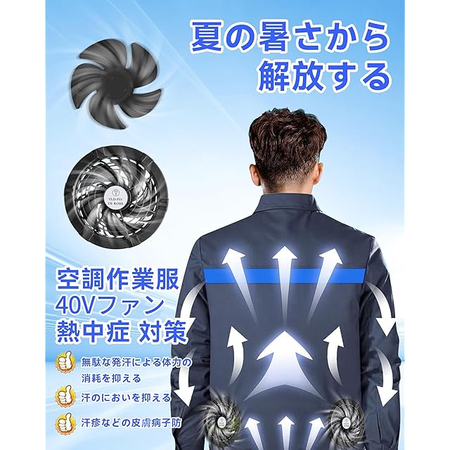 【強風・低騒音】ブラシレスモーターを装備しているこの高品質のファンは、同類製品に比べると、驚きほどのパワーで強力送風して涼しさを保つことができるだけでなく、低騒音。40V 超強力 ファン付き 気流を胸方向や背中方向に集中させることも可能です。夏の幅広い現場作業において、疲労軽減、作業効率の向上、熱中症対策にも効果あります。