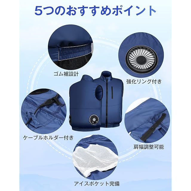 【6つのおすすめポイント】1、UVカット素材を採用し、紫外線からお肌をしっかり守ります。2、ゴム裾設計を取り入れ、密封性がアップした上、バッテリーの重量を分担させます。3、ファンの取り付け部に強化リングが付き、より簡単に取り付けられます。4、肩部分に調節ゴムが設計され、ベストの肩幅を調整可能。5、背後部にアイスポケットを完備。6、ケーブルホルダー付きで、作業中にケーブルの脱落を防ぎます。
