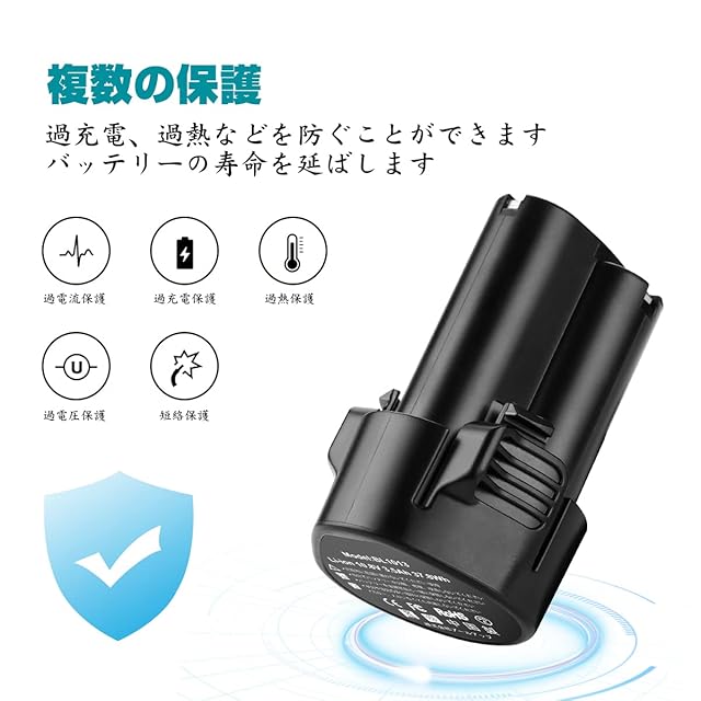 商品の仕様:型番:BL1013 マキタバッテリー10.8V 互換品 電圧:10.8V 容量:3.5Ah(3500mAh) ワット数:37.8W 種類:リチウムイオン電池 数量:2個