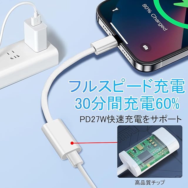 【27W PD対応急速充電】:こちらのusbc ライトニングケーブル 変換アダプタはPD規格に準拠し、最大27Wの出力で急速充電を提供します。iPhoneは約30分で60%充電可能です。