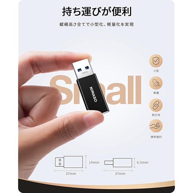 【USB Cメス to USB Aオスアダプタ】Nimaso USB C(メス)からUSB A(オス)の変換アダプターです。USB Aポートと接続して、Type Cインターフェースを備えたスマホ、タブレット、HDD、USBメモリ、イヤホン等その他の設備をPCやチャージャーに簡単に接続できます。▲映像出力、イヤホンマイクは非対応。
