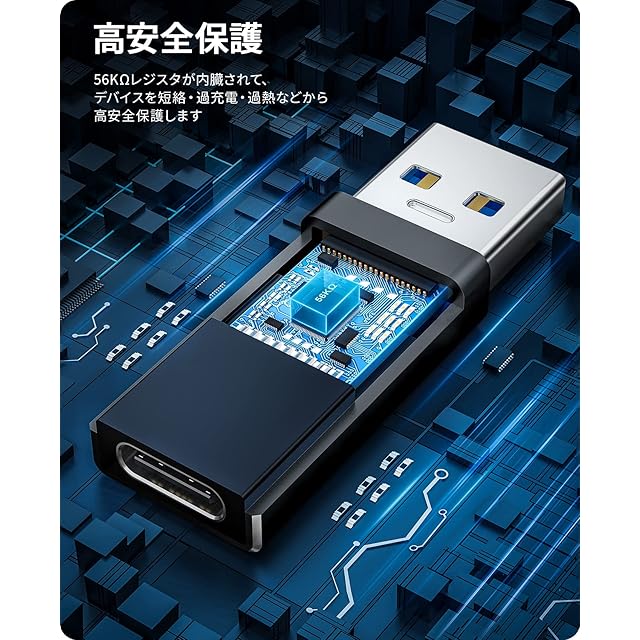 【安全保護】Type Cのプラグ内に56kΩの抵抗を実装していますので、デバイスを短絡、過充電、過熱などから安全保護します。