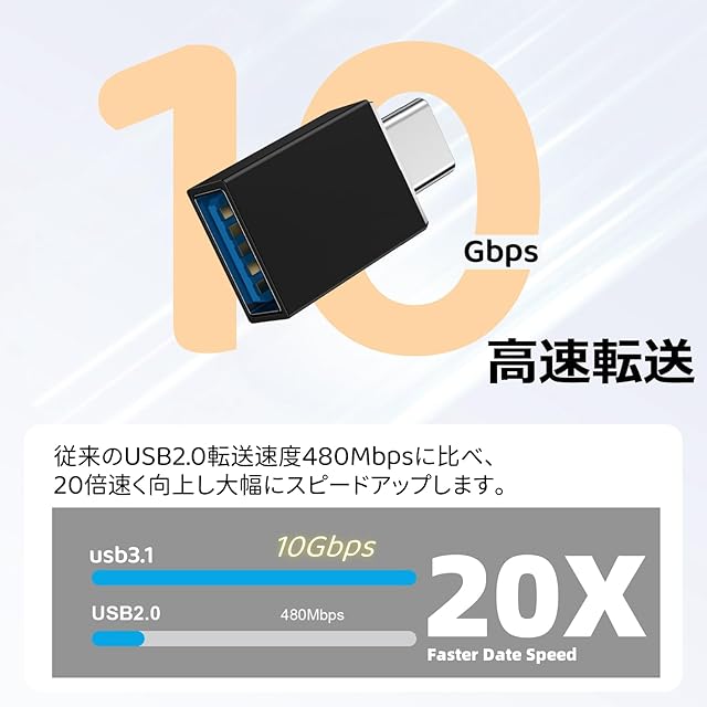 <b>OTG USB Type-C 変換 アダプタ(Type C - USB 3.1 メス)</b><br> 最大10Gbpsの高速データ転送が可能なコンパクトUSB-C & USB-A 変換アダプタ<br> <b>USB 3.1 10Gbps 高速データ転送</b><br> 標準のUSB3.1 に準拠して10Gbpsまでのデータ転送をサポートしており、数秒でHDムービーの転送が可能です。<br> 従来のUSB3.1転送速度480Mbpsに比べ、20倍速く向上し大幅にスピードアップします。<br> USB1.1/2.0にも互換性がありますので、古いUSB機器も接続して使用が可能です。<br> <b>製品の仕様</b><br> サイズ:約28.3x14.6x7.2mm<br> 28.3x14.6x7.2mm 重さ:約4g(1個)<br> <b>QC3.0急速充電</b><br> USB C 変換アダプタはQC3.0、2.0をサポートし、デバイスに5V / 3A、9V / 2A、12V / 1.5A(Max 18W)の電力を供給します。<br> <b>超コンパクト設計</b><br> 隣り合うUSB-Aポートにも干渉しづらい超コンパクト設計を実現しました。<br> <b>小型と軽量の配慮</b><br> 隣との干渉を避けるため、デザイン上小型化、軽量化を実現します。また、紛失を避けるため、ストラップ付いており、<br> キーホルダーみたいにコードに付けておけるます。収納もやすいし、車の中やモバイルバッテリーと一緒に持ち歩けます。<br> <b>高速データ転送</b><br> 動画や映画、音楽などを最大5Gbpsのスピードで高速転送することができます。<br> <b>高い耐久性</b><br> 内外装に高耐久素材を採用し、8000回以上の抜き差しにも耐える高い耐久性を実現しました。<br> Type-C端子は裏表の区別なく、向きを気にせず挿し込み可能です。シームレス型金メッキ端子は最高の導電率と低損失のデータ転送ができます。<br> <b>幅広い互換性(ご参考まで部分の機種を)</b><br> Xperia 10 II / Xperia 1 / Xperia XZ Premium / XZ / XA1 Ultra / XA1 plus<br> Google Nexus 6P / Nexus 5X<br> Huawei Mate 40 Pro / Mate 40 / Mate 30 / Mate 20 pro / Mate 20 / Mate 10 Pro / Mate 10 / Mate 9 / <br> P40 lite / P40 Pro / P40 + / P40 / P30 lite / P30 Pro / P30 / P20 lite / P20 / P10 / P10 + / P9 / P9 + / Honor 9 / Honor 8<br> Galaxy S21 Ultra / S21 / S20 Fe / S20 / S20 + / Z Flip / Z Fold / S10 5G / S10e / S10 + / S10 / S9 + / S9 / S8 +<br> <b>タブレット&ラップトップ</b><br> iPad Air 2020、iPad Pro 2021/2020、Macbook Air M1 / 2018<br> MacBook Pro 2018 / 2017 / 2016/MacBook 2017 / 2016 / 2015<br> Galaxy Tab A7 Lite、A7、S7、S6、S5e、S4<br> <b>USB3.0 A側</b><br> 外付けHDD、USBメモリ、マウス、キーボード、ゲームコントロール、カードリーダーなどのUSB周辺機器<br> <b>ご注意</b><br> 本製品はUSB-A端子のみの接続が可能です。iPhoneには対応しておりません。<br> お使いの携帯電話にOTGフォンクションがあることを確認してください。<br> 読み取り/書き込み速度は内部テストに基づいており、容量、ホストデバイス、システム、およびアプリケーションによって異なる場合があります。<br>