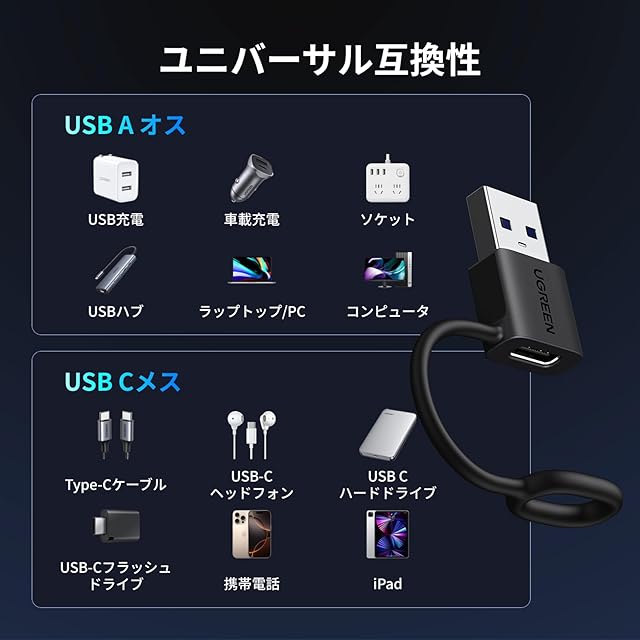 UGREEN USB3.0 USB-C to USB-A 変換アダプター 紛失防止ストラップ付き 2pcs L502