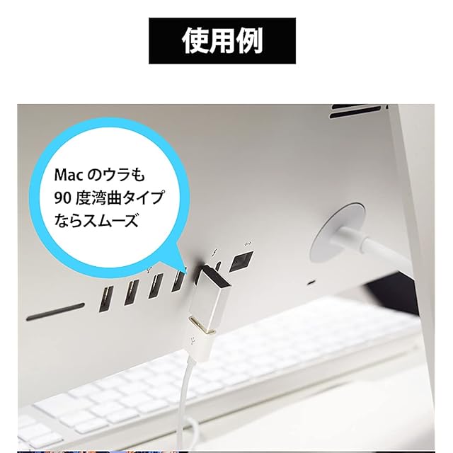 90度湾曲タイプはスマートに装着可能!コンパクトサイズでも高速データ転送、充電対応可能です。<br> iMacの裏も90度湾曲タイプでスマートに装着。<br> Macbookのサイドでも邪魔にならないコンパクトサイズ。<br>