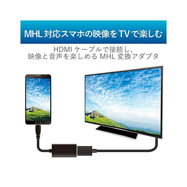 MHLに対応し、USB(microBタイプ)のインターフェースを持つスマートフォンに接続し、HDMI(TypeA)のインターフェースを持つテレビやモニタなどHDMIケーブルで接続し、映像と音声を楽しめるMHL変換アダプタです。