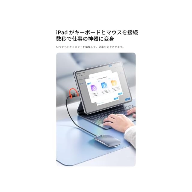 【OTG対応、ファイルを素早く読む】:即座にアクセスして、データをすばやく読み込みます。※接続した機器がOTG機能を対応する必要があります。【即座にアクセス、フォルダーを自動的に生成】:iOS13及び以上のシステムをサポートし、自動的にフォルダを生成し、操作コピー/導入/読み取りなどの操作を行うことができます。【iPadがキーボードとマウスを接続、数秒で仕事の神器に変身】:いつでもドキュメントを編集して、効率を向上させます。※USBディスク、カードリーダーなどを接続すると、自動的にポップアッププロンプトが表示されません。ファイルアプリでファイルをを見つけてください。