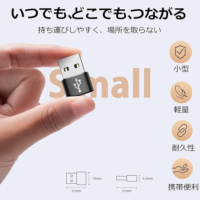 <b>USB Type -C to USB 2.0 変換アダプタ</b><br> USB-AのPCポートまたはACアダプタに、USB-C端子が搭載するスマホ、タブレット、USBメモリ、<br> Webカメラ、イヤホンなどの幅広いUSB-C機器が接続できるUSB C 変換アダプタです。<br> <b>製品の仕様</b><br> サイズ:約21x15x6.5mm/2.1x1.5x0.65cm<br> 重さ:約4g<br> <b>QC3.0急速充電</b><br> USB C 変換アダプタはQC3.0、2.0をサポートし、デバイスに5V / 3A、9V / 2A、12V / 1.5A(Max 18W)の電力を供給します。<br> <b>超コンパクト設計</b><br> 隣り合うUSB-Aポートにも干渉しづらい超コンパクト設計を実現しました。<br> <b>小型と軽量の配慮</b><br> 隣との干渉を避けるため、デザイン上小型化、軽量化を実現します。また、紛失を避けるため、ストラップ付いており、<br> キーホルダーみたいにコードに付けておけるます。収納もやすいし、車の中やモバイルバッテリーと一緒に持ち歩けます。<br> <b>高速データ転送</b><br> 動画や映画、音楽などを最大480Mbpsのスピードで高速転送することができます。<br> <b>高い耐久性</b><br> 内外装に高耐久素材を採用し、8000回以上の抜き差しにも耐える高い耐久性を実現しました。<br> <b>非対応機種</b><br> Samsung Note10 / S9 / S10e / S10+ / S20 / S20 Ultra<br> Google Pixel 3XL / 4<br> HUAWEI Mate30 Pro<br> <b>ご注意</b><br> 本製品はUSB-A端子のみの接続が可能です。iPhoneには対応しておりません。<br>