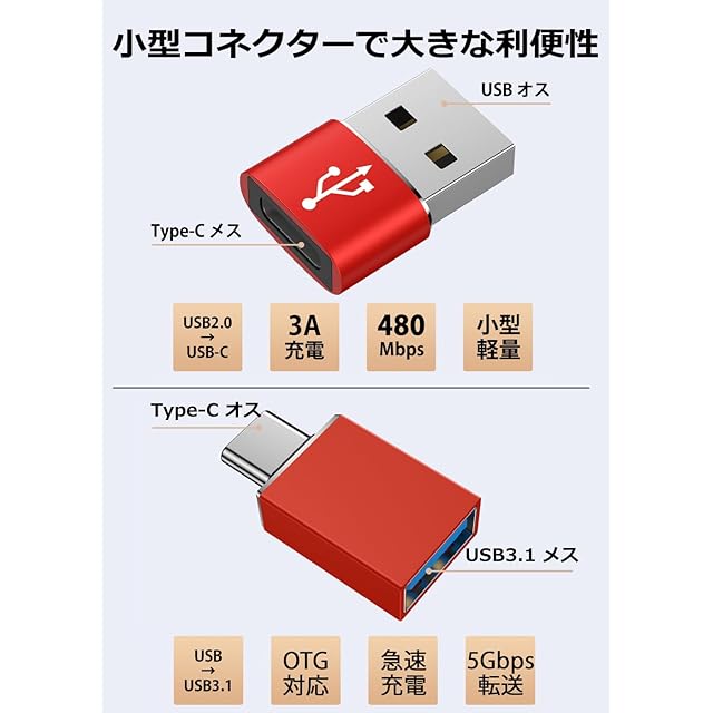 <b>USB CメスからUSBオスアダプター2個とUSB CオスからUSBメスアダプター2個が含まれます。</b><br> <b>USB 2.0 & USB-A 変換アダプタ 2個セット</b><br> 最大480Mbpsの高速データ転送が可能なコンパクトUSB-A & USB-C 変換アダプタの2個セット<br> <b>USB Type -C to USB 2.0 変換アダプタ</b><br> USB-AのPCポートまたはACアダプタに、USB-C端子が搭載するスマホ、タブレット、USBメモリ、<br> Webカメラ、イヤホンなどの幅広いUSB-C機器が接続できるUSB C 変換アダプタです。<br> <b>製品の仕様</b><br> サイズ:約21x15x6.5mm/2.1x1.5x0.65cm<br> 重さ:約6g(1個)<br> <b>------------------------------------------------------------------</b><br> <b>OTG USB Type-C 変換 アダプタ(Type C - USB 3.0 メス)</b><br> 最大10Gbpsの高速データ転送が可能なコンパクトUSB-C & USB-A 変換アダプタ<br> <b>USB 3.1 5Gbps 高速データ転送</b><br> 標準のUSB3.1 に準拠して5Gbpsまでのデータ転送をサポートしており、数秒でHDムービーの転送が可能です。<br> 従来のUSB2.0転送速度480Mbpsに比べ、10倍速く向上し大幅にスピードアップします。<br> USB1.1/2.0にも互換性がありますので、古いUSB機器も接続して使用が可能です。<br> <b>製品の仕様</b><br> サイズ:約28.3x14.6x7.2mm<br> 28.3x14.6x7.2mm 重さ:約4g(1個)<br> <b>高い耐久性</b><br> 内外装に高耐久素材を採用し、8000回以上の抜き差しにも耐える高い耐久性を実現しました。<br> Type-C端子は裏表の区別なく、向きを気にせず挿し込み可能です。シームレス型金メッキ端子は最高の導電率と低損失のデータ転送ができます。<br> <b>幅広い互換性(ご参考まで部分の機種を)</b><br> Xperia 10 II / Xperia 1 / Xperia XZ Premium / XZ / XA1 Ultra / XA1 plus<br> Google Nexus 6P / Nexus 5X<br> Huawei Mate 40 Pro / Mate 40 / Mate 30 / Mate 20 pro / Mate 20 / Mate 10 Pro / Mate 10 / Mate 9 / <br> P40 lite / P40 Pro / P40 + / P40 / P30 lite / P30 Pro / P30 / P20 lite / P20 / P10 / P10 + / P9 / P9 + / Honor 9 / Honor 8<br> Galaxy S21 Ultra / S21 / S20 Fe / S20 / S20 + / Z Flip / Z Fold / S10 5G / S10e / S10 + / S10 / S9 + / S9 / S8 +<br> <b>タブレット&ラップトップ</b><br> iPad Air 2020、iPad Pro 2021/2020、Macbook Air M1 / 2018<br> MacBook Pro 2018 / 2017 / 2016/MacBook 2017 / 2016 / 2015<br> Galaxy Tab A7 Lite、A7、S7、S6、S5e、S4<br> <b>USB3.0 A側</b><br> 外付けHDD、USBメモリ、マウス、キーボード、ゲームコントロール、カードリーダーなどのUSB周辺機器<br> <b>ご注意</b><br> お使いの携帯電話にOTGフォンクションがあることを確認してください。<br> 読み取り/書き込み速度は内部テストに基づいており、容量、ホストデバイス、システム、およびアプリケーションによって異なる場合があります。<br>