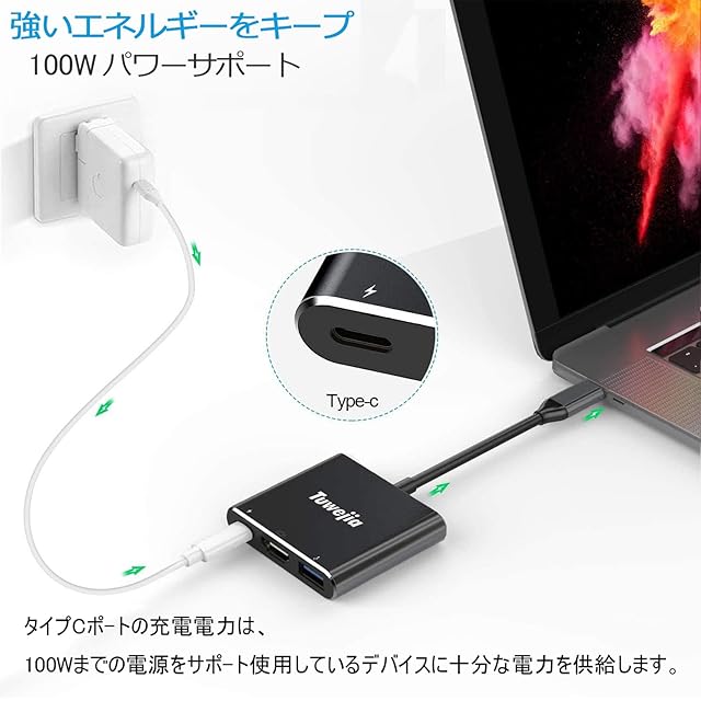 【USB Type-C HDMI 変換アダプター 3in1ー2025版】:Tuwejia USB C Type C To HDMIへのアダプターは、パソコンやタブレットのUSB Type-CポートをHDMI 4K@30Hz出力ポート、PD 100W充電ポート(充電のみ対応、映像出力非対応)、USB-A 3.0ポートに拡張します。iPhone 15やiPadの画面をテレビ、プロジェクター、モニターにミラーリングします。すべてのポートが同時に動作します。ソフトウェアやドライバー、複雑なインストールプロセスは不要です。充電、データ転送、映像・音声出力が楽しめます。展示会、プレゼンテーション、ホームシアターエンターテイメント、オフィス、旅行などに最適です。