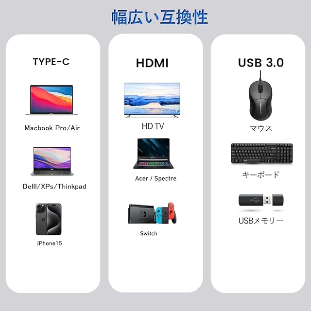 【幅広い互換性】:USB C hdmiおよびUSBアダプタは、USBタイプCポートを使用するデバイスと互換性があります。iPhone 15/15 Plus/15 Pro/15 Pro Max、iPhone 16/16 Plus/16 Pro/16 Pro Max、MacBook/MacBook Pro 2025/24/23/22/21/20/19/18、Macbook Air 2025/24/23/22/21/20/19/18、iMac 2025/24/23/22/21/20、Galaxy S25/24/23/22/21/20/S10、Surface Book,Dell XPS13/15、Acer Chromebook、Google Chromebook、Huawei MateBook HPなどの他のタイプCデバイス。USB3.1 Gen2またはThunderbolt 3/4(映像出力とデータ転送に対応)をサポートするフル搭載USB Cポートを備えたパソコン、USB3.1 Type CとDP Alt Mode機能を備えたスマホに対応。(注:iPhone 16Eには対応していません)