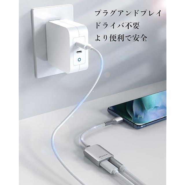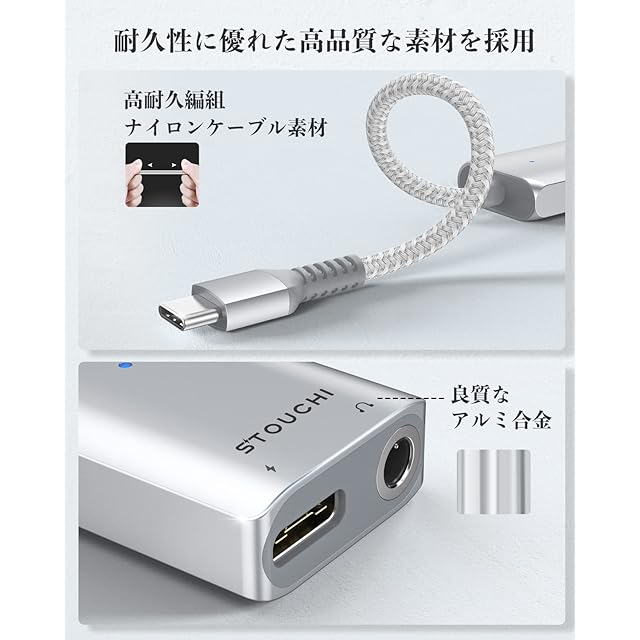 USB Type C to 3.5mm イヤホン変換アダプター Stouchi 2in1 DAC搭載 24bit/96kHz Hi-Fi音質 30W高速充電PD/QC対応 幅広い交換性 高耐久編組ナイロンケーブル アルミ製 タイプCイヤホン変換ケーブル 二股 音楽再生 通話·音量調節可能 iPhone16/15シリーズに対応でき(Silver)