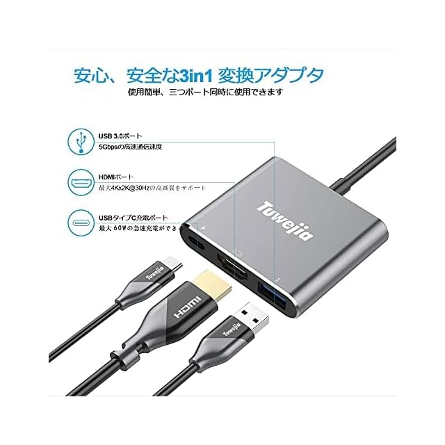 USB Type-c HDMI アダプタ Tuwejia Usb タイプc 4K 解像度 hdmiポート+USB 3.0ポート+USBタイプC急速PD充電ポート変換 アダプタ UHD iPhone 16/15/MacBook Pro/MacBook Air 2025 iPad Pro 2025/Galaxy S25/usb c デバイス対応