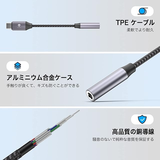 【耐久性が抜群】ナイロン編みのオーディオケーブルと高品質なアルミニウム合金のプラグは、耐久、柔軟、耐酸化・腐食防止の特徴があり、安心に使えるイヤホンジャック 変換 タイプcです。