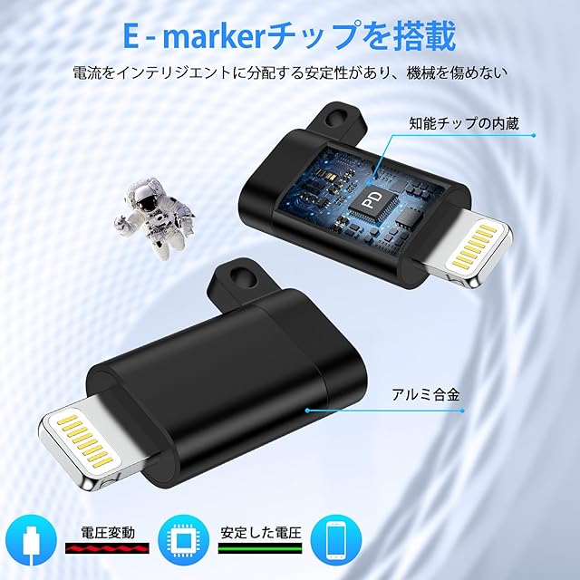 【知能チップ搭載&高品質素材】内蔵されたスマートチップが接続した機器の電流電圧を自動調節し、安定した急速充電を行います。過充電・損傷・発熱を防ぐ安全設計です。アルミ合金素材を採用して、高速に放熱可能ですし、性能が安定しています。精密なiPhone 変換アダプタにより、スムーズに抜き差すことが可能です。インターフェースは平らで、ぴったりとフィットし、緩みません。