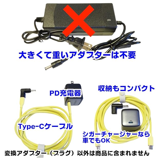 ・出力電圧は出荷前に全て確認済です。(Anker製PD充電器にて実施)</br> ・別途USB PD対応の充電器・ケーブルが必要です。</br> ・出力電圧の刻印つき。</br> ・USB Type-Cに統一できるので、スマートフォン等各種機器と充電器を共用・荷物の削減になります。</br> ・シガーソケット対応の充電器を使えば、車でも使用できます。100V電源・コンバーター等は不要です。(12V PD出力が可能な充電器が必要)</br> ・機器により、純正のACアダプター以外での使用に制限がかかる場合があります。(充電できない、低速充電となる、警告が表示される等)</br> ・ご購入前に、端子の形・寸法・電圧等をよくご確認ください。</br> ・製造時期により外観が多少変更となる場合があります。</br> </br> 使用できない原因のほとんどは、</br> ①充電器がUSB PD対応でない。12V出力できない</br> ②充電器のW数(出力)が足りない</br> ③ケーブルが3A以上に対応していない</br> ④PD充電器・使用機器との相性</br> となっています。</br> 充電器・ケーブル等の条件を全て満たさないと使用できません。