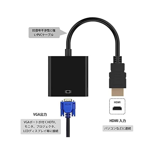 1080p までの HDMI 出力を VGA 入力(D-Sub 15ピン)へ変換するアダプタです。信号を増幅する機能はありませんので 5m 以内の HDMI 出力でご利用下さい。(パッシブタイプの変換アダプタです。) <br> この変換アダプタに電源は不要です。 <br> 音声出力機能はありません。 <br> VGA 入力機器の最大解像度にご注意下さい。 <br> ケーブル長:15cm(全体25cm)