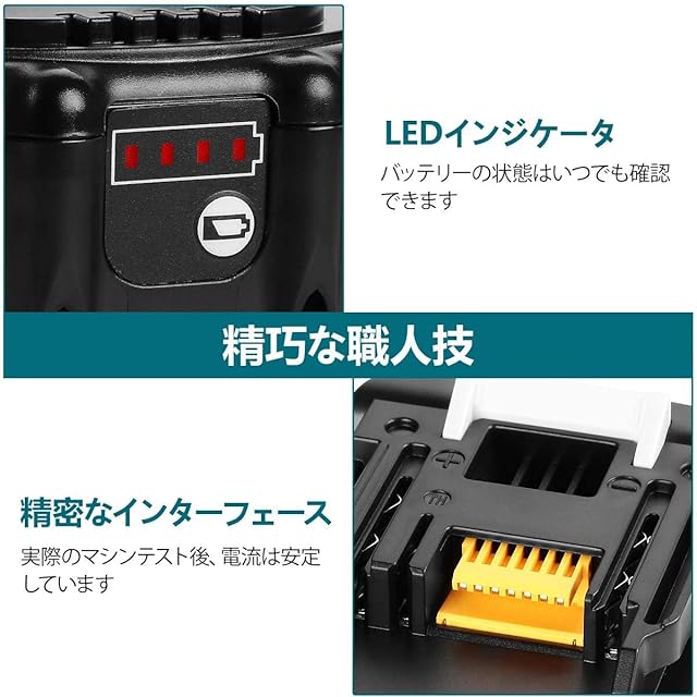 6000mAh大容量+LED残量表示:6.0mAh大容量で、長い時間作業が实现します。軽いリチウムイオンバッテリーので高容量ながら小型、軽量が実現できる。マキタ18Vバッテリー純正と同じように充電、使用できます。メモリ効果がないため、継ぎ足し充電も可能になりました。確認ボタンを押したら、4段階の残量が見えます、とっても便利です。
