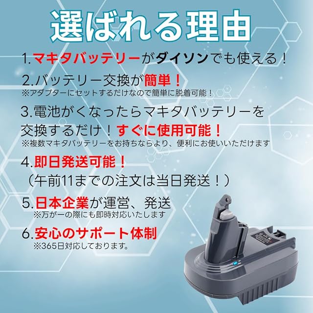 マキタバッテリーでダイソン掃除機を使える変換アダプター <br> <br>安心の国内ブランド「Longsafe」が提供する便利な変換アダプターです。お手持ちのマキタ18Vバッテリーでダイソンのコードレス掃除機V6シリーズを使用できるようになります。バッテリー交換の手間やコストを大幅に削減できる画期的な製品です。 <br> <br>■簡単装着システム <br>工具不要でのワンタッチ装着を実現。マキタバッテリーの着脱もスムーズで、どなたでも簡単に使用できます。 <br> <br>■軽量コンパクト設計 <br>アダプター本体は120gという軽量設計。サイズも11cm×7cm×10cmとコンパクトなので、掃除機の操作性を損なうことなく快適に使用できます。 <br> <br>■対応掃除機 <br>ダイソンV6シリーズ(SV09、SV08、SV07、HH08、DC74、DC62、DC61) <br>※一部非対応機種があります <br> <br>■対応バッテリー <br>マキタ18Vシリーズ(BL1820、BL1830B、BL1840B、BL1850B、BL1860B) <br>※14.4V、ライトバッテリー、マルチボルト36Vには対応しておりません <br>※バッテリー、充電器は別売りです <br> <br>■使用上の注意事項 <br>・このアダプターはバッテリーの充電には使用できません。充電時はアダプターを外してください。 <br>・バッテリー残量が完全になくなる前に充電することをお勧めします。 <br>・メーカー推奨使用方法ではない為、ご利用は自己責任にてお願いします。 <br>・万が一の機器の故障の場合、責任は負いかねます。 <br> <br>Longsafeは高品質な製品と安心のサポートを提供する国内ブランドです。