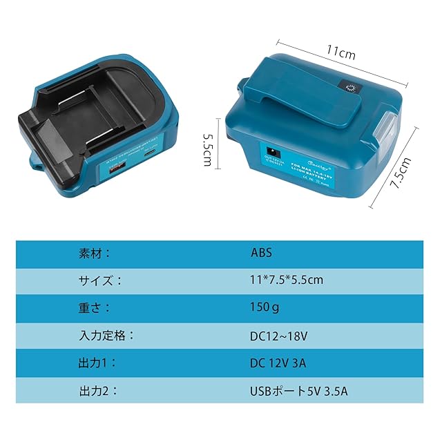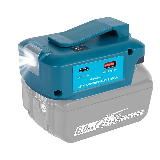 ADP05 USBアダプターはMakita18Vバッテリーを対応できます。 この製品は、PDポートとQC3.0ポートがあります。 PD(Type-C)とQC3.0端子の最良の機能は高速充電、より良い設計はパワー22.5wで大きなエネルギー伝送の送信速度です。 ライト「ボタン」を押して、照明機能を使用します。 3つの照明モードがあり、環境ニーズに応じて調整できます。停電時用に最適です。