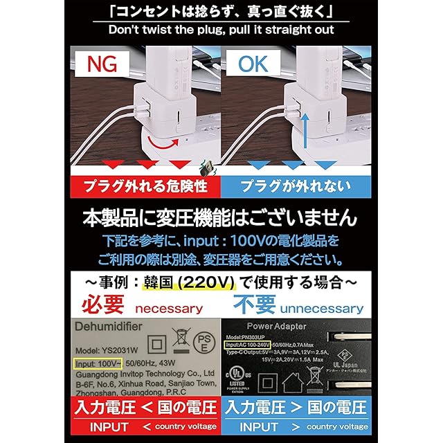 本製品に変圧機能はございませんので、ご使用の際は必ず電圧をご確認ください。100-240V対応と表記の電化製品は海外仕様電化製品のため、変圧器がなくても使用可能です。100Vとしか記載がないものは日本国内国内仕様のものの為、別途変圧器をご用意ください。また、炊飯器、ヘアドライヤーなどの高出力電化製品は変圧器と併用してご使用いただく必要があります。