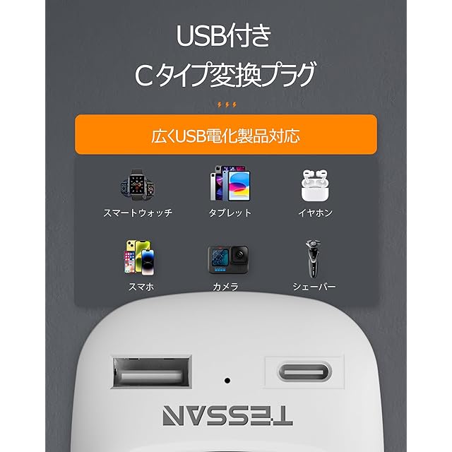 変換プラグ cタイプ 韓国対応 TESSAN 海外変換プラグ USB-AとUSB-C付き 海外コンセント対応 韓国/ベトナム/ヨーロッパ/フランス/ドイツ/イタリア/スペインなど用 海外旅行 便利グッズ