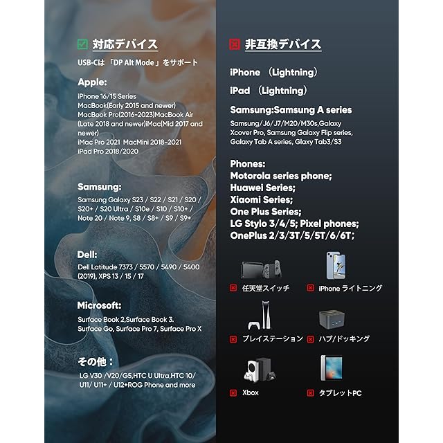 【保障サービス】お客様に安心してHighwings のusb c to hdmi ケーブルをご使用していただきたくため、ご購入後の1年間の保証対応いたします。注: 弊社の製品は長すぎるHDMI ケーブルには適していません。最大5メートルのHDMI ケーブルを使用し、エクスペリエンスには影響しません。この長さより長いシナリオで使用する必要がある場合は光ファイバーケーブルを使用することをお勧めします。USB-Cデバイスは USB Type-C DP Alt モードをサポートする必要があります。