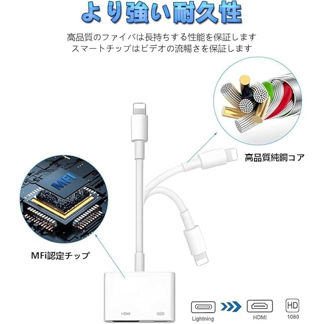 【正規認証品・MFi認証】:このiphone hdmi 変換ケーブルは、最新の変換テクノロジーに適合した高品質の銅線ケーブルがあり、画質の歪み、ゴースト、尾引きなどの不安定な要素を避け、1080pの高精細な画像を実現できます.ビデオと音声を同期して転送することで、映画館のような映像をお楽しみいただけます.伝送速度は通常のiphone hdmi変換ケーブルの10倍以上となっています.