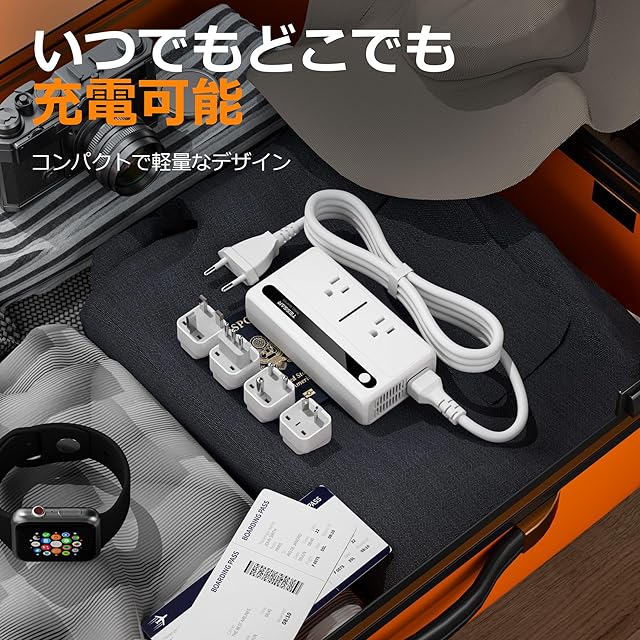 【6台同時充電可能】変圧器・変換プラグ・電源タップ・USB急速充電器が一体となった多機能タイプ。ACコンセント2口とUSBポート4口(USB-C×2)を備え、最大6台の機器を同時に充電できる電源変換器です。これ1台で各種アダプターが不要になり、荷物もすっきり。海外出張や旅行をより快適にお楽しみいただけます。旅行 便利グッズです。